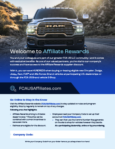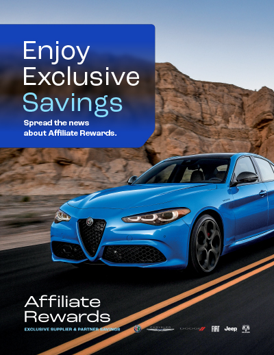 Through the program they have elite access to Affiliate Rewards Preferred Pricing on eligible Chrysler Dodge Jeep and RAM Brand vehicles.